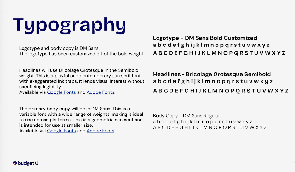Typography across the brand uses a unique grotesque San Serif for headers and bold statements, and a supporting geometric San Serif to balance that out for most other copy.